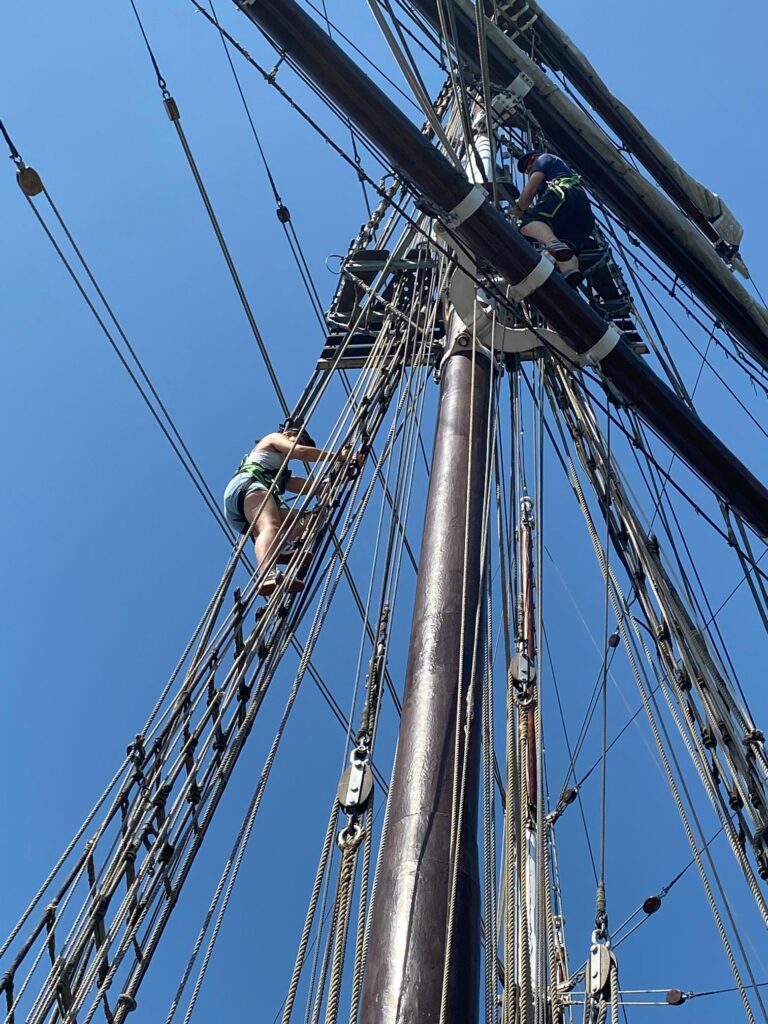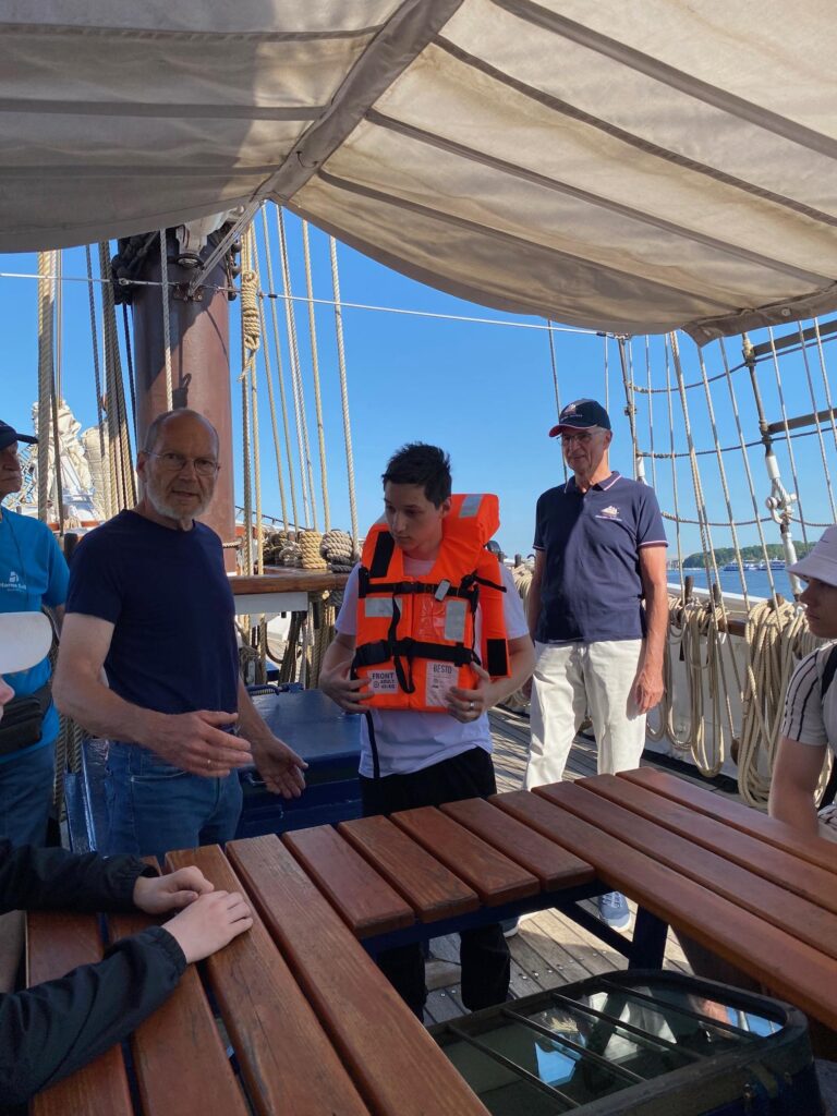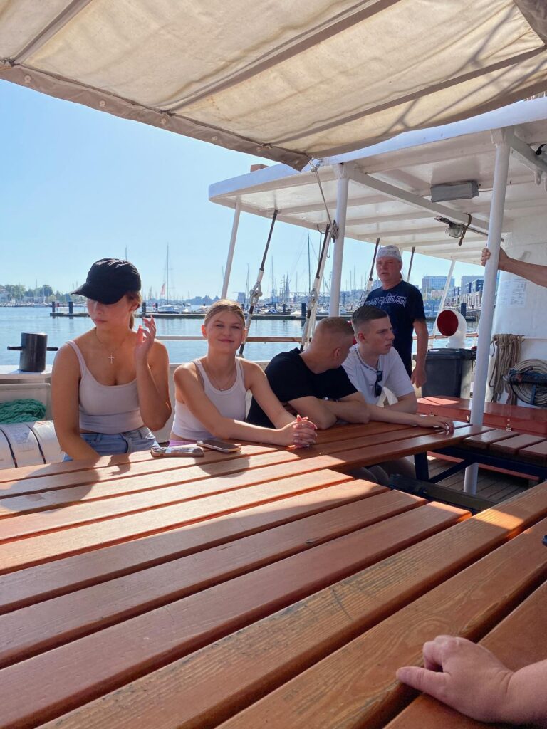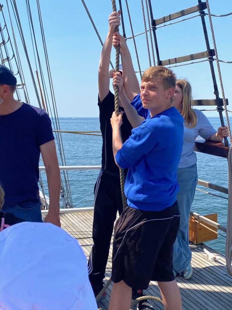 Am 02. Juli ging es für unsere Klasse 9b, im Rahmen einer Berufsorientierungsmaßnahme, mit der Santa Barbara Anna auf der Warnow vom Rostocker Stadthafen in Richtung Warnemünde. Unterwegs erhielten unsere Schülerinnen und Schüler viele Informationen über Firmen und wirtschaftliche Standorte entlang der Warnow. Auf die vielen Fragen zu unseren Werften ist das Team der „Maritimen Spurensuche“ eingegangen und hat diese geduldig und mit vielen interessanten Fakten beantwortet. Bei kühlen Getränken und einem Imbiss haben die Jugendlichen die Gelegenheit genutzt, um noch einmal individuell mit der Besatzung ins Gespräch zu kommen. Angelegt wurde am Marinestützpunkt „Hohe Düne“. Dort wurde die Klasse von zwei jungen Männern in Marineuniform empfangen und zur Besichtigung der Korvette „Magdeburg“ abgeholt. Bei der Führung erfuhren wir viel Wissenswertes über die Ausbildung sowie die verschiedenen Tätigkeiten und die computergestützte Technik an Bord. Ein leckeres Mittagessen rundete diesen Besuch ab. Anschließend ging es weiter auf die Ostsee zu einem Segelmanöver. Dort durften wir tatkräftig beim Hissen der Segel unterstützen. Einige mutige Schülerinnen und Schüler trauten sich und kletterten gut gesichert und unter Aufsicht den Mast auf bis zu 18m Höhe hinauf. Andere versuchten sich im Knüpfen von Knoten und führten nette Gespräche mit der Crew. Unsere Fahrt endete gegen 16:00 Uhr im Stadthafen. Wir bedanken uns bei allen Beteiligten für diesen wunderschönen und ereignisreichen Projekttag bei schönstem Kaiserwetter.