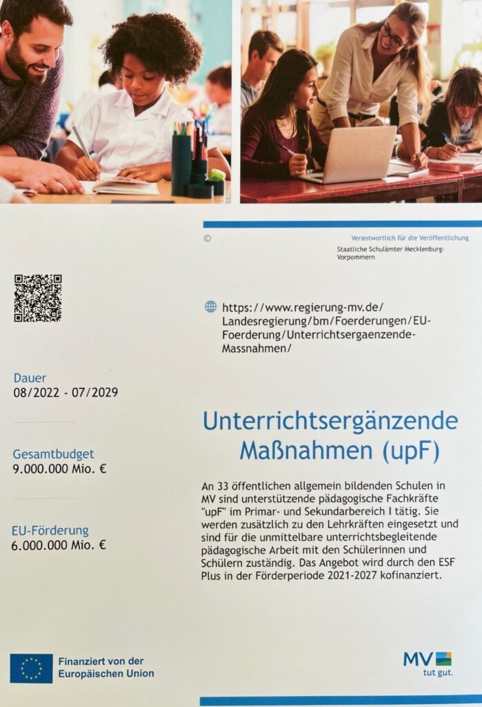 Das Projekt Unterrichtsergänzende Maßnahmen (upF) wird im Rahmen des ESF Plus Programms 2021-2027 des Landes Mecklenburg-Vorpommern durch das Ministerium für Bildung und Kindertagesförderung aus Mitteln des Europäischen Sozialfonds Plus der Europäischen Union sowie des Landes Mecklenburg-Vorpommern gefördert
